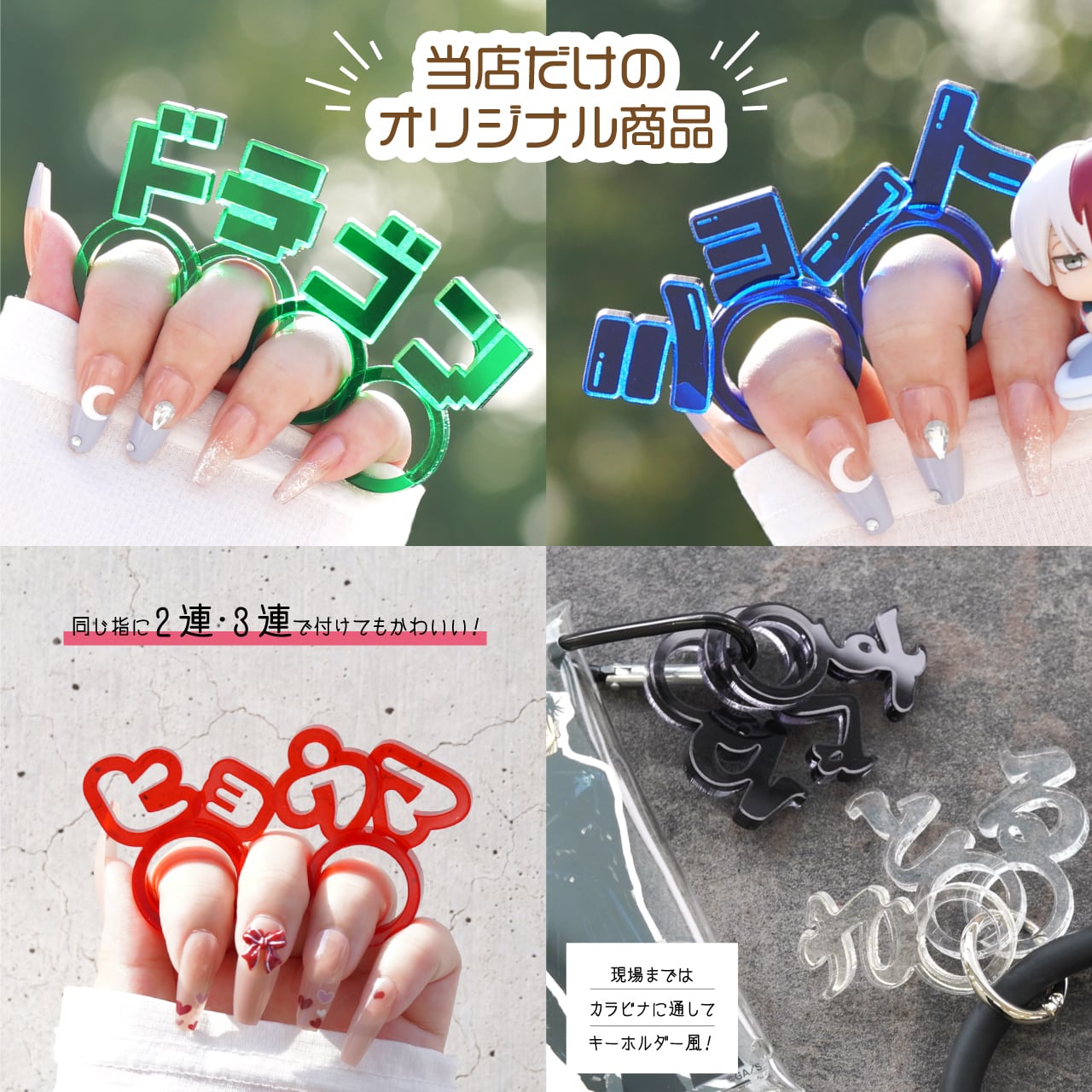 リングサイズは4種類ございます。アクリルを切り出して作成しますので、